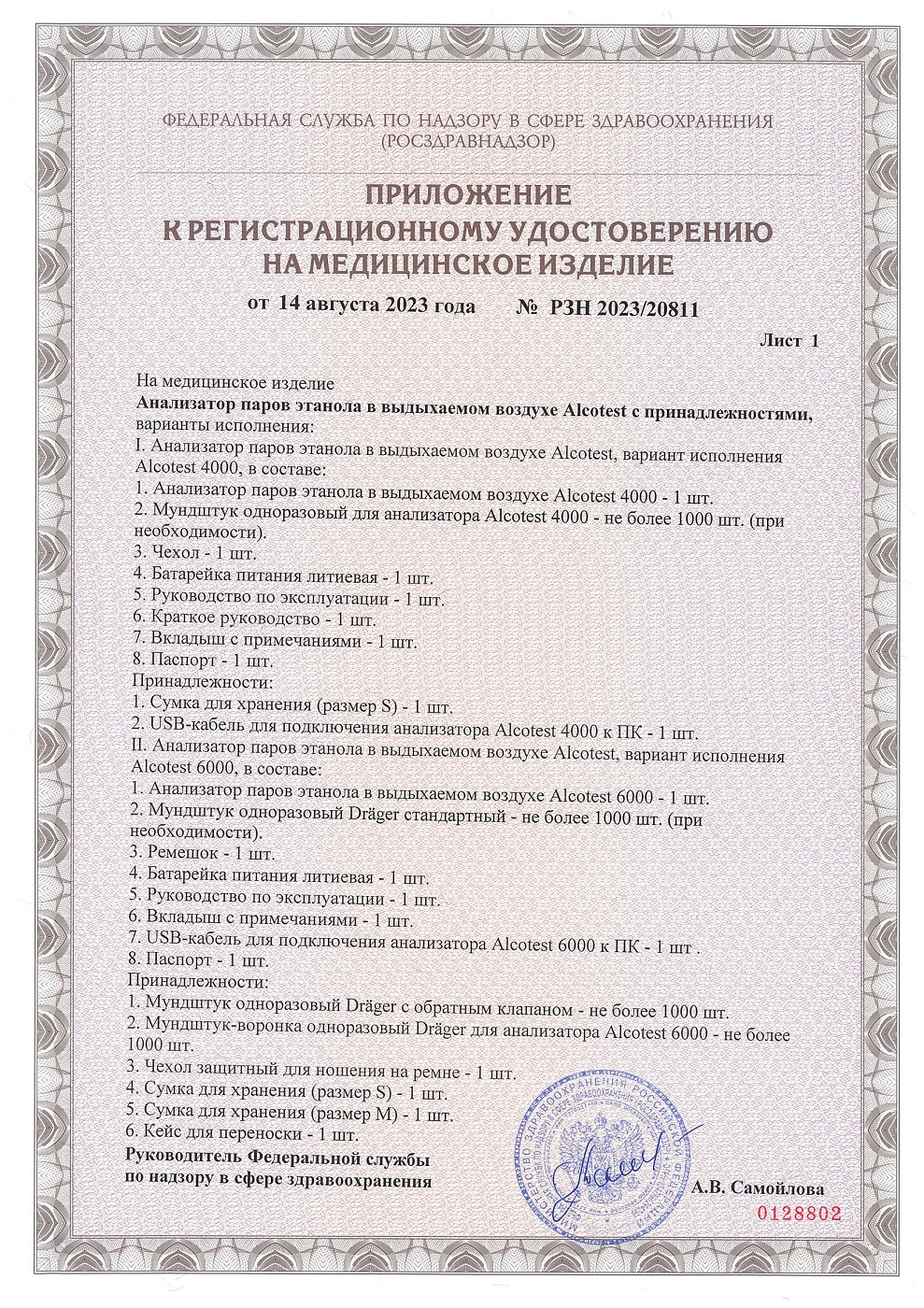 ВАЖНО! Алкотестер Drаger "Alcotest 4000" прошел регистрацию в Федеральной Службе по надзору в сфере здравоохранения. На него получено регистрационное удостоверение на медицинское изделие. Данный прибор допущен к обращению на территории Российской Федерации.