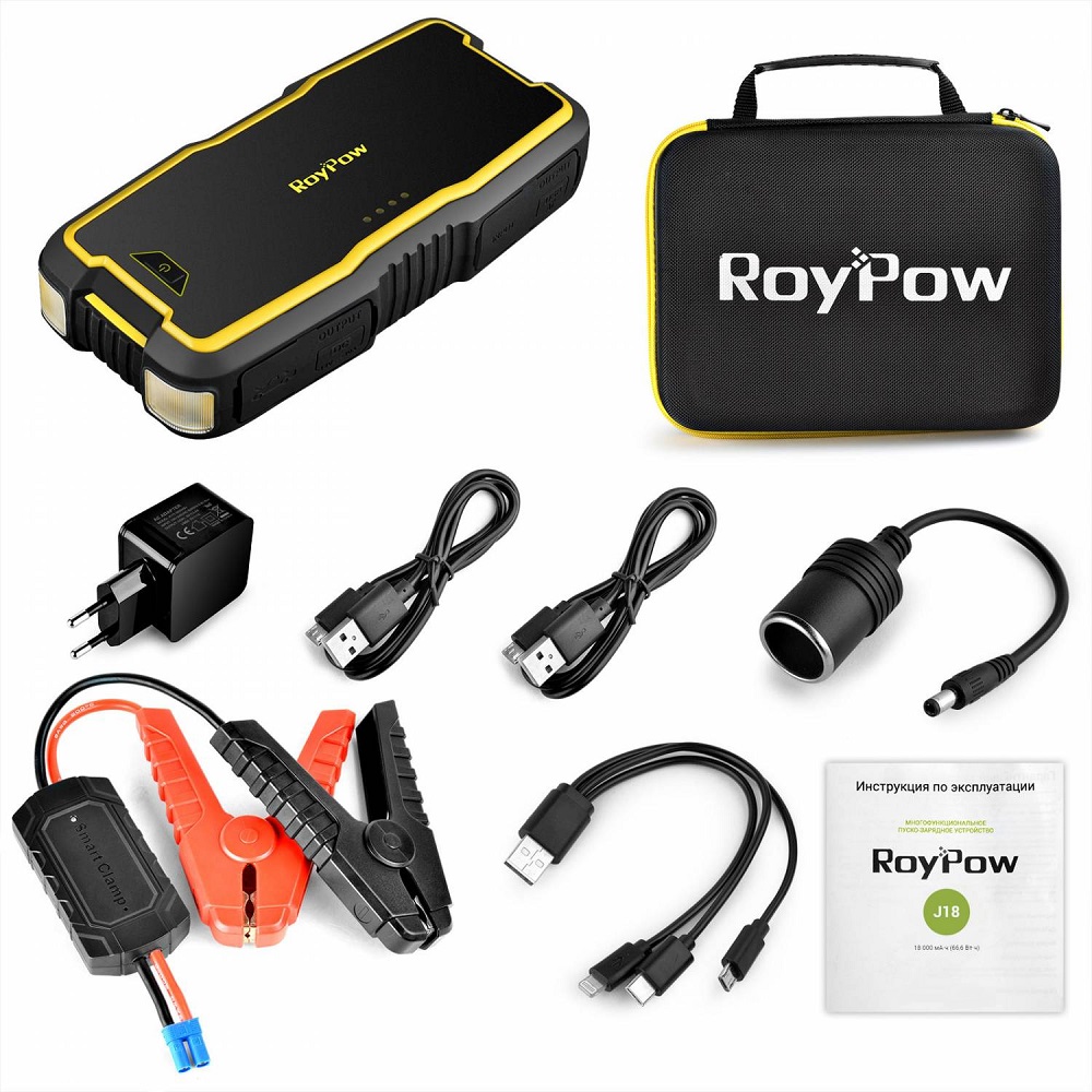Помимо различных кабелей и переходников, в комплект поставки ПЗУ "RoyPow J18" входят силовые провода "крокодилы". Как и у всех других моделей ПЗУ от "RoyPow", данные провода обладают интеллектуальной системой защиты, предотвращающей возникновение короткого замыкания и других поломок электроники прибора. При накидывании проводов на клеммы аккумулятора авто, неопытный водитель-новичок может перепутать "плюс" и "минус", но даже в этом случае инвертор не сломается, а электрика автомобиля не пострадает. Защитный блок на силовых проводах отключит ПЗУ и предотвратит перегорание схем. Данное устройство станет отличным приобретением как для опытных, так и для молодых начинающих автолюбителей, а также для всех, кто подыскивает для себя мощный многофункциональный powerbank.